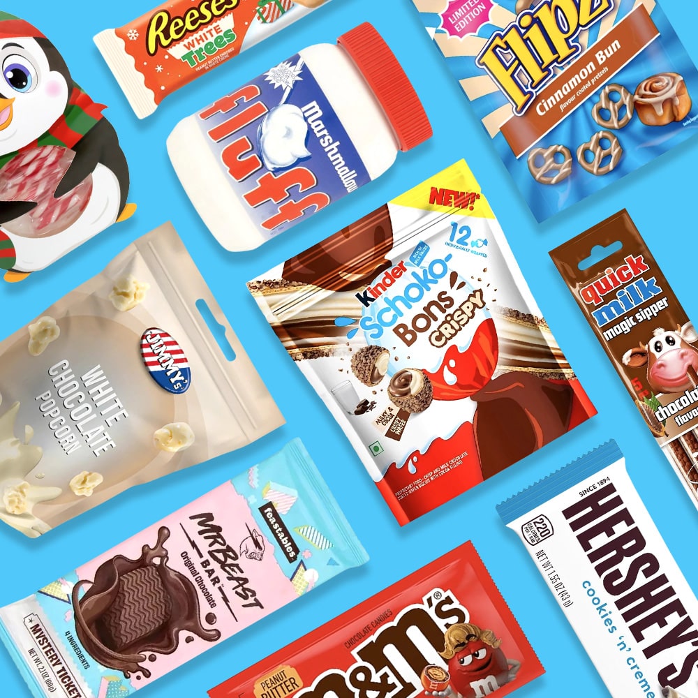 Hershey's Bar Milk Chocolate & Almonds Lion Bar White Chocolate Reese’s Peanut Butter Milk Chocolate Tree Reese’s Peanut Butter White Chocolate Tree Big Werther's Original Caramel Popcorn Bretzel Charm's Fluffy Stuff Cotton Candy Flipz Milk Chocolate Mentos Strawberry Mix Quick Milk Magic Sipper Vanilla Quick Milk Magic Sipper Chocolate Becky's Marshmallow Toppers Vanilla M&M's Caramel Cold Brew Becky's Lollipop Winter Becky's Magic Dark Chocolate Balls Filled With Marshmallows JB Candy Canes Multicolor